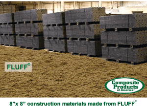 The Composite Products ProcessAt the Composite Products of America factory, we are busy producing useful products from a recycled material called Fluff®. Shown below is Fluff and the 8x8 building materials made from the same Fluff. The materials are strong, heavy, water resistant, termite resistant, and perfect for outdoor use.